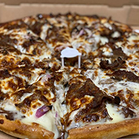 DONAIR (Halal)DONAIR SWEET SAUCE BASE, MOZZARELLA CHEESE, DONAIR MEAT, ONIONS |