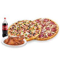 Two 12" Medium Pizzas, 10 Chicken Wings, 2 Dips & 1 POP (2 Ltr) |