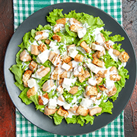 CHICKEN CAESAR SALADCHICKEN, LETTUCES, PARMESAN CHEESE, OLIVE OIL, CROUTONS TOSSED WITH OUR CAESAR SALAD DRESSING |