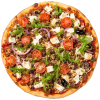 GREEKTOMATO SAUCE, MOZZARELLA CHEESE, FETA CHEESE, GROUND BEEF, ONIONS, GREEN PEPPER, BLACK OLIVE, COOKED TOMATOS |